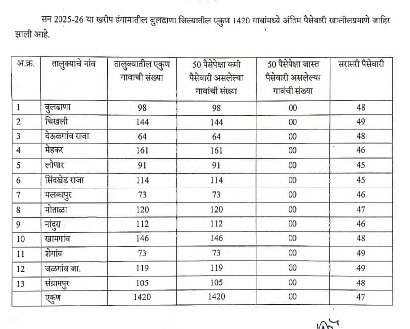 जिल्ह्याची सरासरी पैसेवारी : ४७ टक्के – चिखली, जळगाव जामोद व शेगाव – ४९ पैसे, लोणार व सिंदखेड राजा – ४५ पैसे, उर्वरित तालुके – ४६ ते ४८ पैसे. तालुकानिहाय सर्व १४२० गावांमध्ये पैसेवारी ५० पैशांखाली नोंदविण्यात आली आहे.