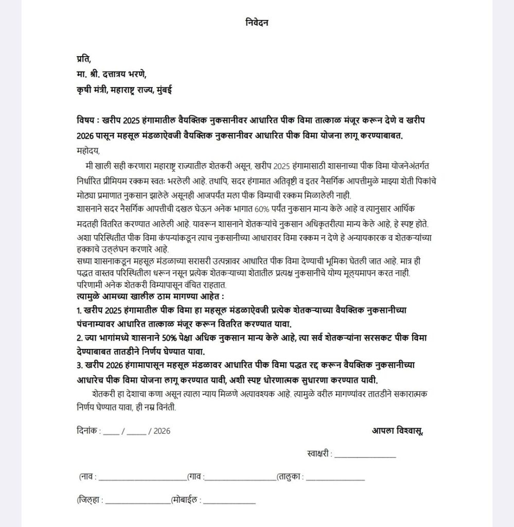आपल्या हक्काच्या पीक विम्यासाठी नक्की निवेदन द्या. तुमचं एक निवेदन आपल्या हक्काच्या पीकविमा योजनेला वाचवू शकत