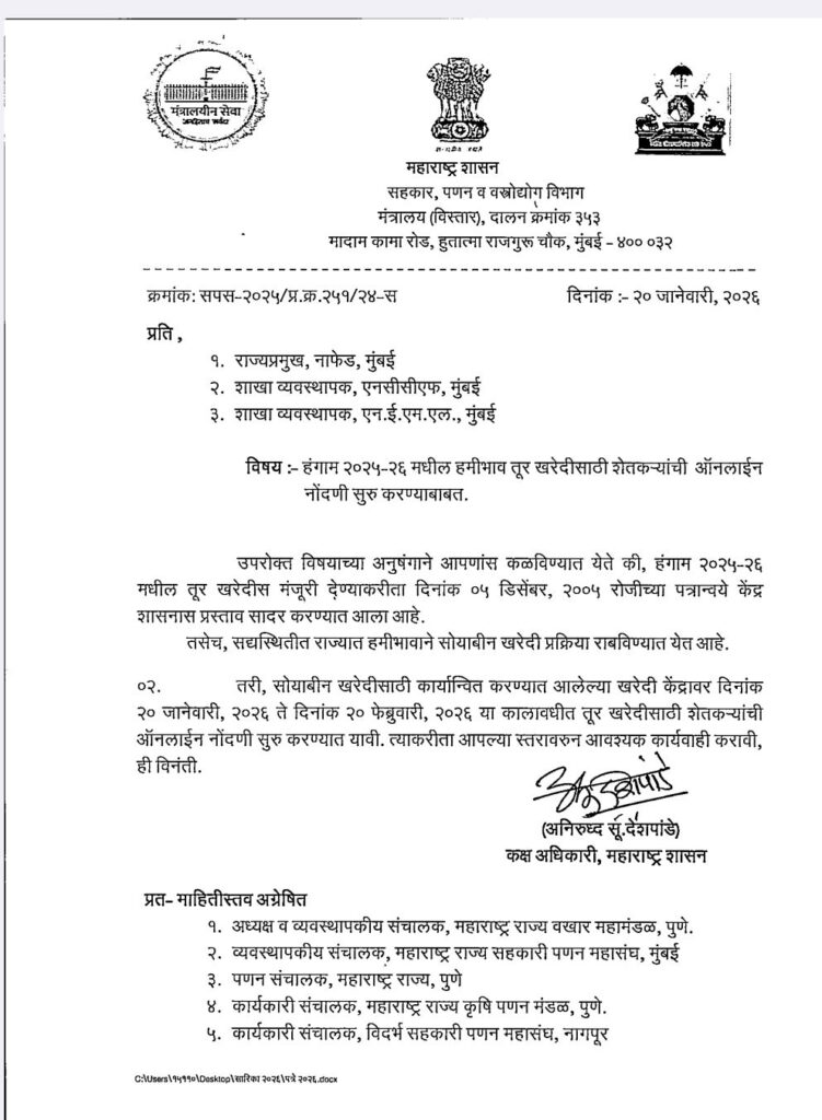 यावर्षीचे जे राज्यातील तुरीचे उत्पादन उत्तम होणार आहे, यामुळे खरेदीसाठी नोंदणी कधी सुरू होणार यासाठी मोठ्या प्रमाणात विचारणा केली जात होती.